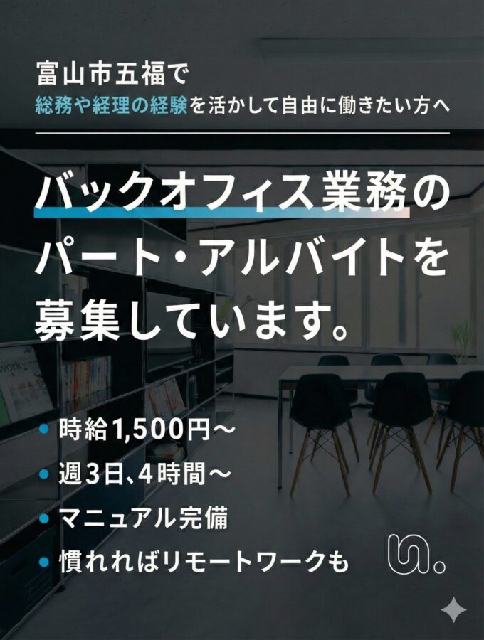 株式会社UNISPOTでは、事業拡大に伴い、会社の基盤を支えるバックオフィススタッフ(パート・アルバイト)を募集します。 当社はまだ7期目の成長企業です。「整った環境で効率よく働きたい」けれど「変化や新しいツールにも柔軟に対応できる」、そんな方を求めています。