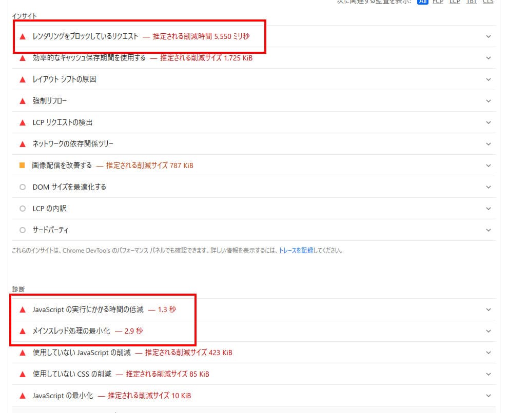 スコアの改善を行うためには指標の「First Contentful Paint」「Largest Contentful Paint」