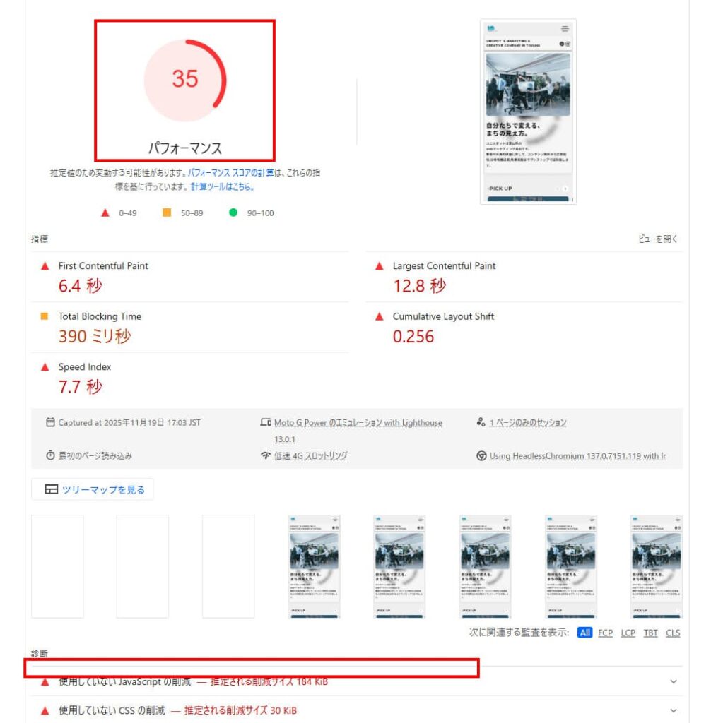 レンダリングをブロックしているリクエストは「5550ミリ秒」から「600ミリ秒」に大幅改善されているにもかかわらず、総合スコアは33と下がってしまいました。
