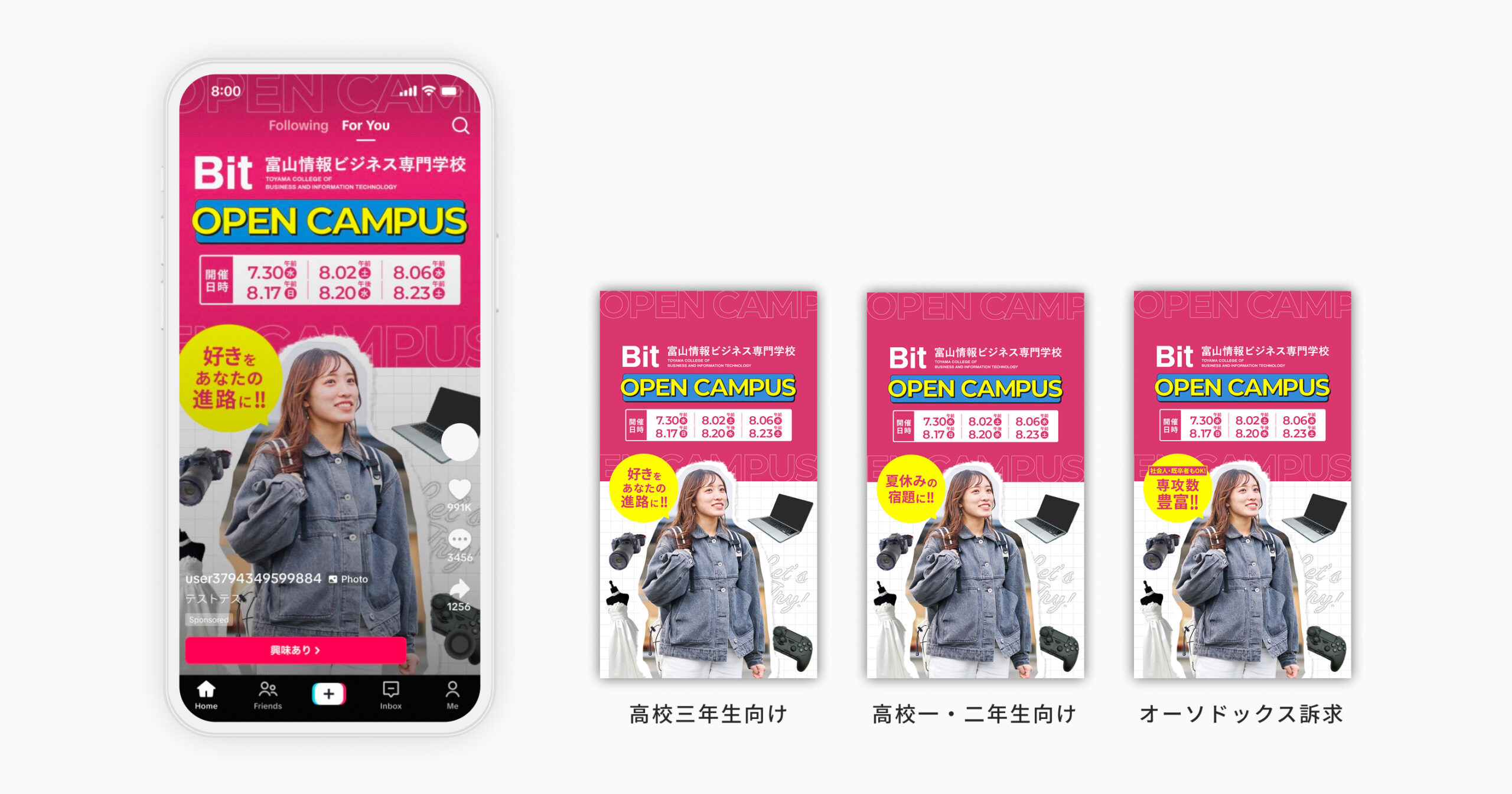 学生や若い世代の利用率が高いTikTok広告を活用し、効果的に情報を発信。