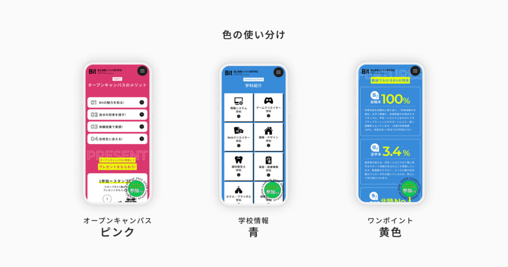 「学校情報=青」「オープンキャンパス=ピンク」「ワンポイント=イエロー」と、情報の種類ごとに色を分けて整理。