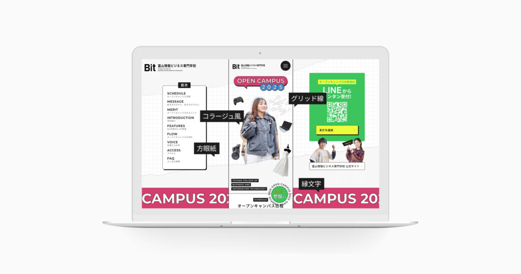「雑誌風のデザインにしたい」という要望に合わせ、学生層に響くコラージュ風×グリッドデザインを採用。