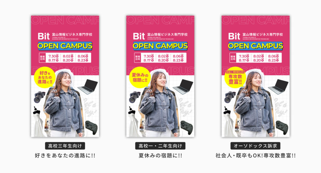 「高校三年生向け」「高校一・二年生向け」「社会人・既卒向け」の3パターンを作成し、ターゲットに合わせたコピーを設計しました。