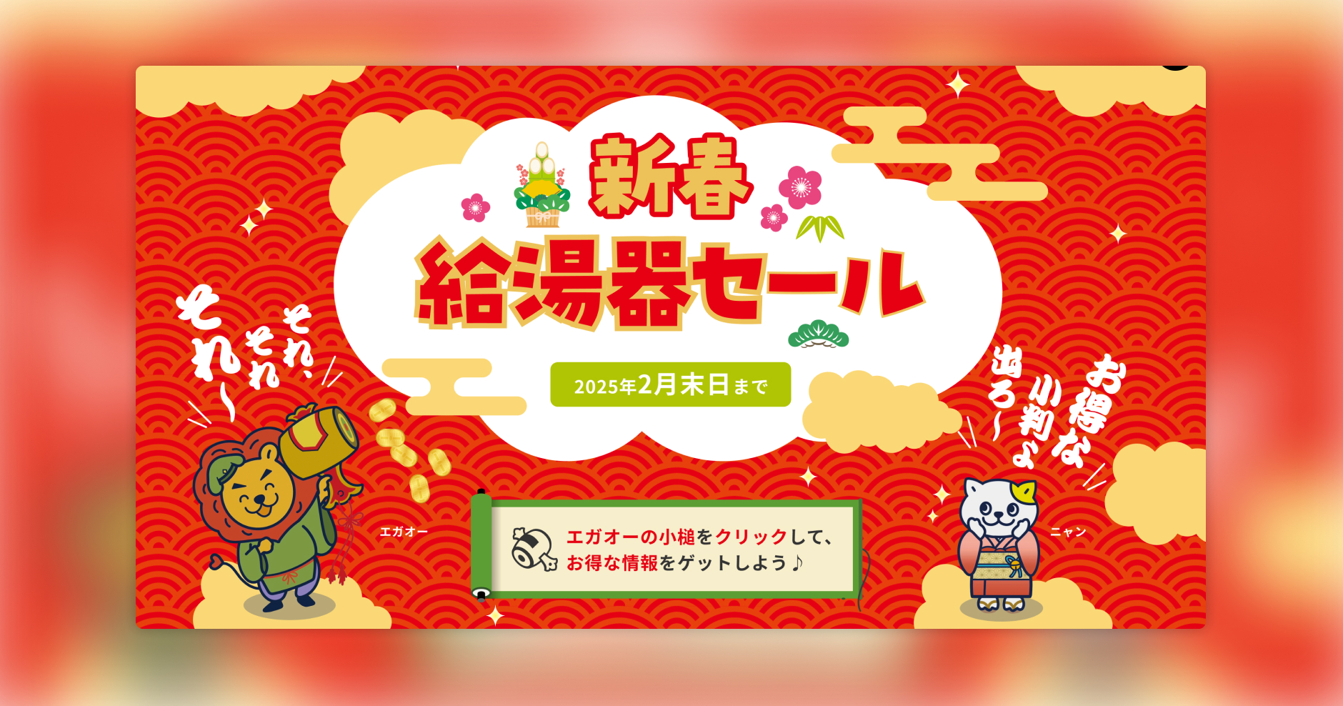 お得な情報が盛りだくさんなイメージを小判が沢山湧くアニメーションで表現した、新春給湯器セールのキャンペーンLPとなっています。